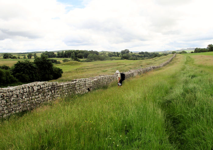 In the morning we were able to make a slightly earlier start from the hotel to the Hadrian’s Wall path and Eastwards. This day’s route ran mainly through farmland, with skylarks overhead, but with almost no Wall to be seen. The weather forecast had indicated rain but we had only one very brief shower and much warm sunshine, so I was glad to be wearing shorts. We reached our destination of Lanercost Priory with plenty of time to explore around the Augustinian priory and its 13th century church, as well as taking advantage of its tea room. Some real rain came just as the coach came to pick us up, which was acceptable. We then stayed for two nights at a very good pub called Twice Brewed, which was just off the main ridge of hills along which the Wall runs, and provided convenient access for the following days.