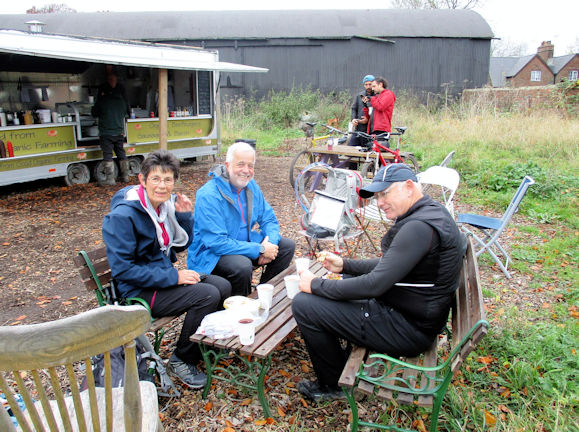 The Iron Age hill fort just behind the white horse is a huge double ditch and earthwork complex - very similar to Barberry Castle a few miles down the Ridgeway. We headed off down the Lambourne Way, expecting the path to be very muddy but the walking was fine. After a short coffee break an hour or so into the walk we headed off downhill, crossing arable fields and along farm tracks and then skirting around Ashdown House and forest. On the way we passed stone circles and burial mounds. In what seemed no time at all we arrived at the Bronze Age Ridgeway track. In recent years this ancient track has suffered erosion by overuse from SUVs churning up the surface for their 'fun'. The introduction of 'tank trap' blocks at strategic points along the way has helped the situation. Our part of the Ridgeway was in good order. We saw several cycle groups and a few horse riders on the Ridgeway. As we were approaching a path crossroads we felt it was arounf lunchtime - and were pleasantly surprised to see a 'pop up' mobile cafe in a farmyard. We all enjoyed a hot drink (and more for some) and a sit down!